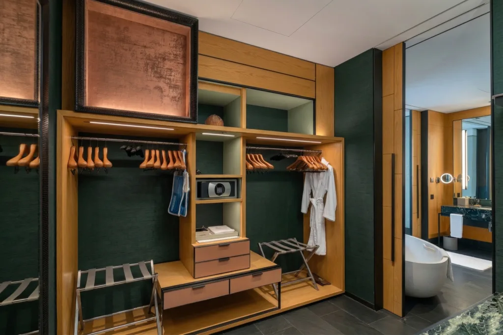 În multe proiecte hoteliere, spațiul este limitat, iar optimizarea nu înseamnă reducerea mobilierului, ci integrarea inteligentă a funcțiilor. Soluțiile integrate, precum dulapurile încorporate în nișe sau aliniate cu pereții, noptierele suspendate sau depozitarea inclusă în panourile din jurul patului, creează un spațiu coerent și aerisit, fără fragmentare vizuală.